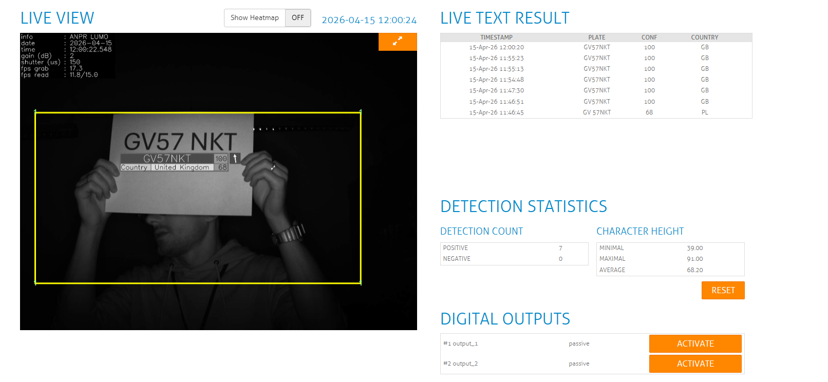 As shown in the screenshots above, you can test this out using a printed out number plate held in front of the camera.
