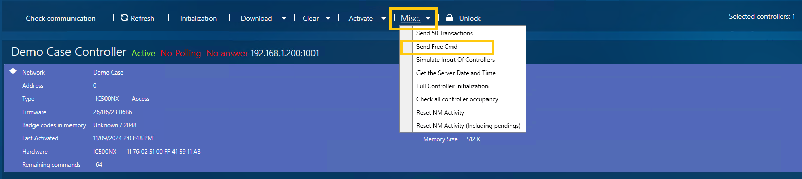 - Click Send and the command will be sent to the controller, which will then act as if it was a real badge being read at the reader.