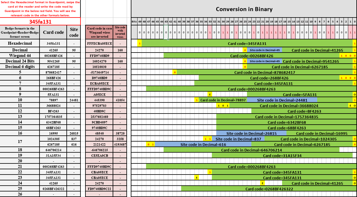 When SensorAccess controllers receive a card code from readers, they can convert this code into various formats. This allows different representations of the same card to be displayed in GuardPoint10.