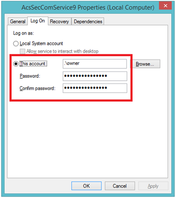 - In the Properties of the new service, open the Log On tab and add the relevant account credential details.