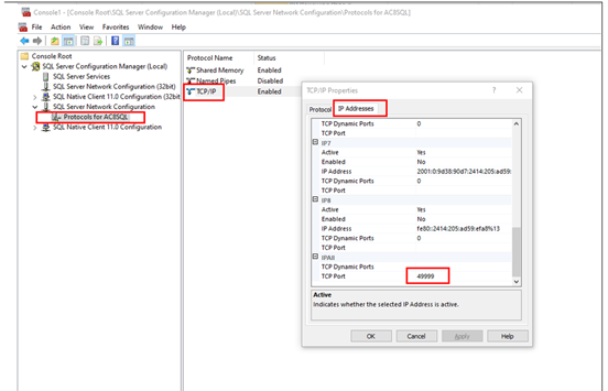 - Open the Microsoft Management Console (MMC) on the machine where the SQL server is installed. Ensure the TCP Port is set to 49999.