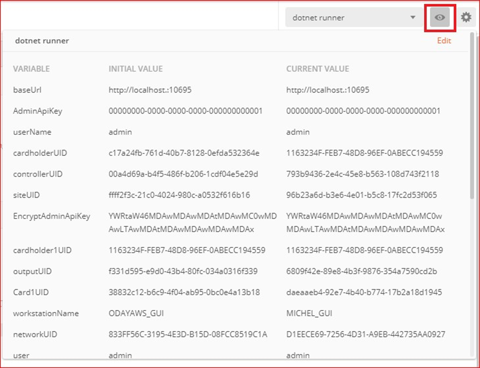 After fetching entities (via GET), their UIDs are stored as environment variables (e.g. {{cardholderUID}}).