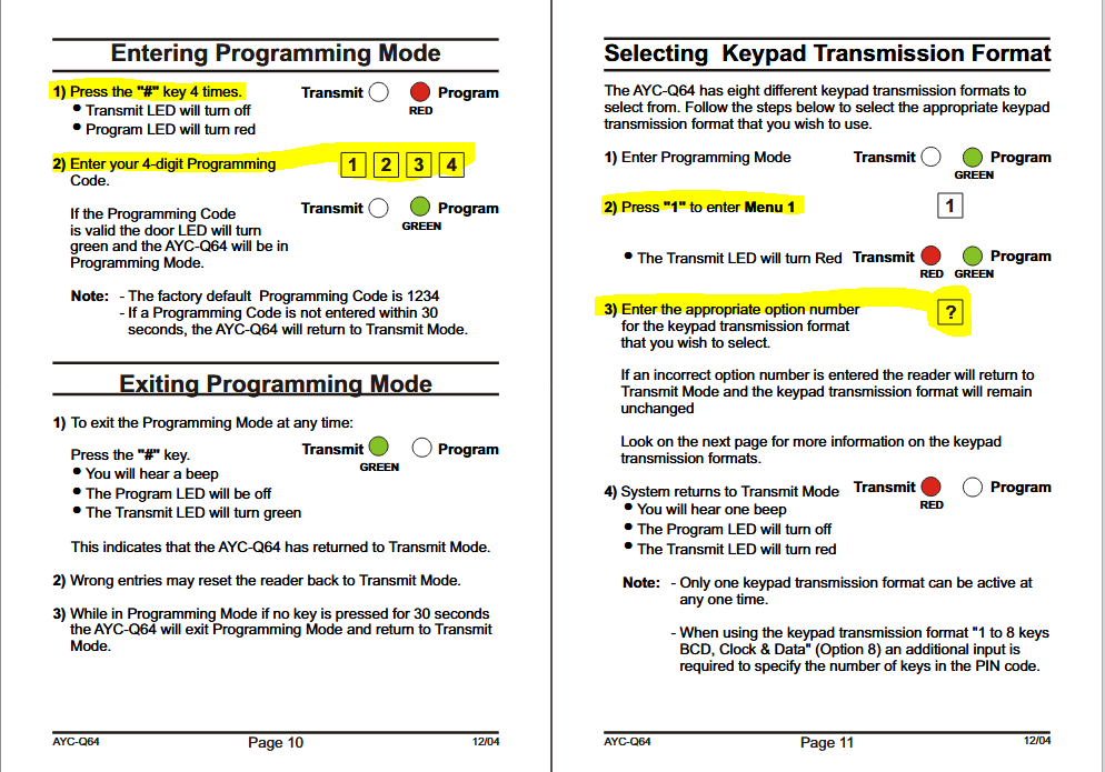 To use PINs on a Rosslare AYC-Q64 with GuardPoint10, the reader must be set to the correct keypad transmission format. If the wrong format is used, GP10 receives the wrong value and will deny the PIN.