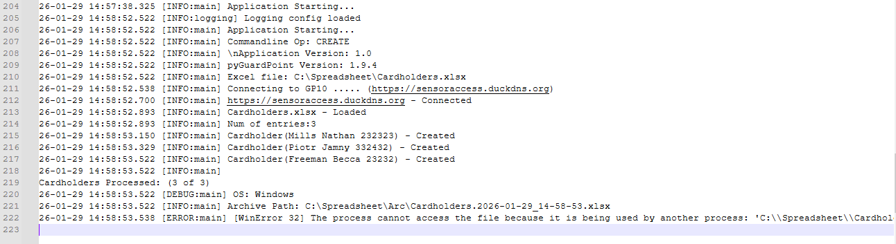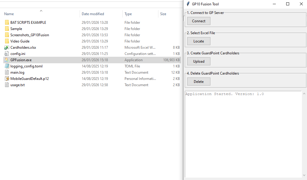 The GPFusion tool provides a simple and flexible way to automate the creation, invalidation, and deletion of cardholders in GuardPoint 10 using spreadsheet data. Rather than relying on a fixed HR export format, the tool can work with any Excel file, provided the column structure matches the mappings defined in its configuration file.