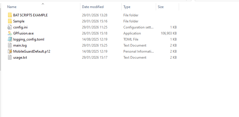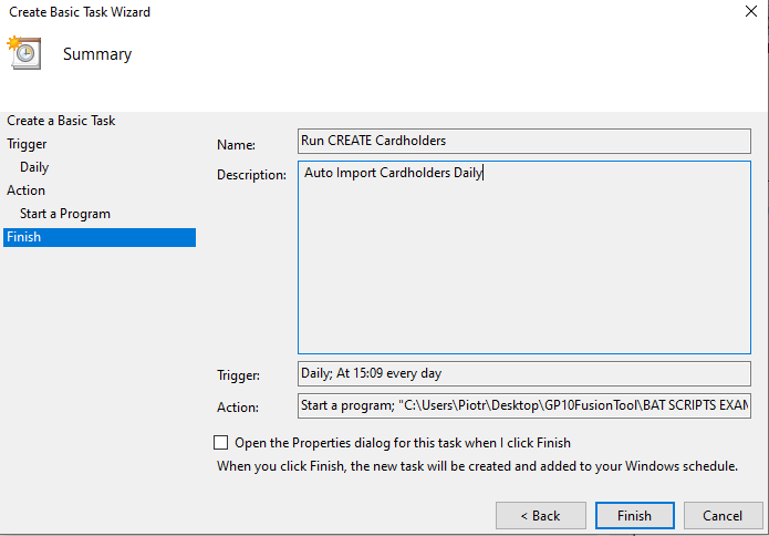 Once GPFusion commands have been encapsulated into batch (.bat) files, they can be executed automatically without user interaction. This allows cardholder data to be synchronised on demand or on a defined schedule, using existing GuardPoint 10 features or standard Windows tooling.