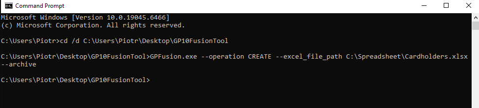 Before running the tool, you must first change directory to the location where GPFusion.exe is stored. This ensures the executable, configuration file, and any required supporting files are accessible.